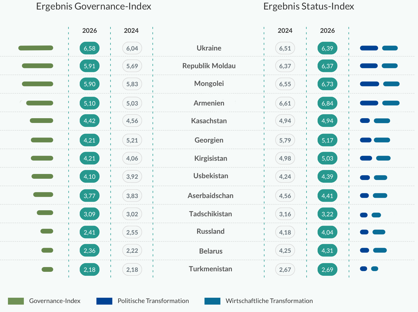 Die immer effizientere und transparentere Verwendung von öffentlichen Mitteln ist einer der Gründe dafür, weshalb die Ukraine im Governance-Index den besten Wert seit dem BTI 2006 erreicht, und ihre regionale Spitzenposition gefestigt hat. Beispiele für gelungene Initiativen sind die Einführung eines Public Investment Management (PIM) Systems sowie der Europäische HUB: ein Konsultationsmechanismus zwischen Regierung, Wirtschaft, Gesellschaft und den internationalen Partnern. Auch Moldau gelingt ein Governance-Allzeithoch, vor allem aufgrund der vertieften internationalen Zusammenarbeit. Auf gleichbleibend gutem Niveau bewegt sich die Mongolei, nun schon seit einem Jahrzehnt.