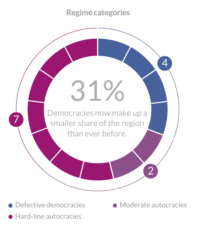 Die Region bleibt von einer doppelten Spaltung geprägt: neun Autokratien stehen nur vier Demokratien gegenüber; zugleich teilt der Krieg sie in Opfer, Unterstützer und neutrale Profiteure. Die beiden Teilungen sind nicht deckungsgleich. Zwar sind die beiden Opfer – die Ukraine direkt und Moldau indirekt – Demokratien und die beiden Unterstützer – Russland und Belarus – Autokratien. Zum neutralen Lager gehören aber auch die Demokratien Armenien und die Mongolei.