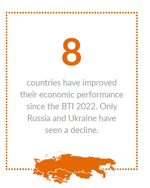 Deutlich gemischter fällt die Bilanz in den Kategorien darunter aus: in Armenien verringerte sich die innergesellschaftliche Konfliktintensität etwas, zudem gelang es der Regierung, unpopulärere Maßnahmen wie die Grenzregelung mit Aserbaidschan ohne repressive Maßnahmen zu implementieren. Kasachstan bleibt die einzige Autokratie mit „mäßiger“ Regierungsführung, obwohl die im Zeichen des „Neuen Kasachstan“ versprochene Modernisierung der öffentlichen Verwaltung sowie die Stärkung der Zivilgesellschaft sich als rhetorische Manöver entpuppt haben.