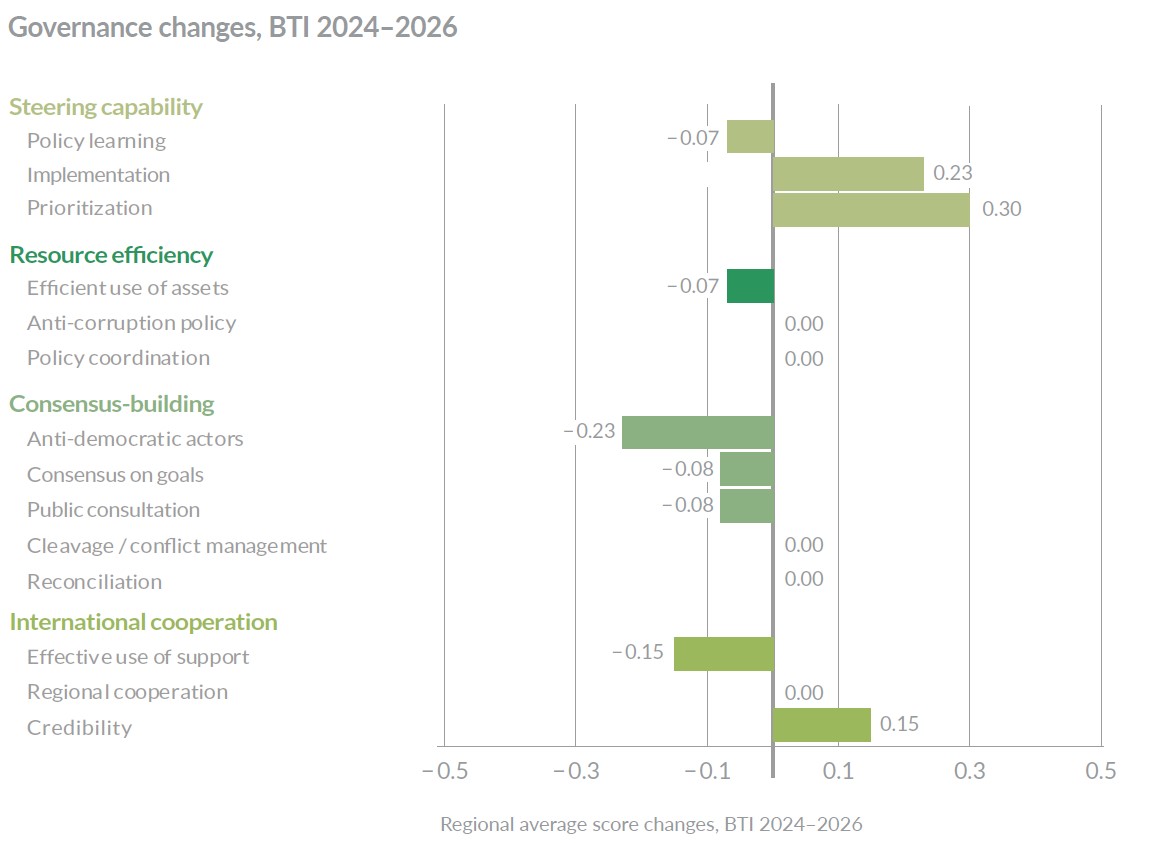 Georgiens Abstufung in die Gruppe der Länder mit „schwacher“ Regierungsführung ist die Konsequenz von signifikanten Verschlechterungen in allen relevanten Dimensionen der Regierungsführung: von der internationalen Zusammenarbeit über die Korruptionsbekämpfung bis hin zum Umgang mit der Zivilgesellschaft und dem Konfliktmanagement. Die übrigen Autokratien werden unverändert schlecht regiert. Als „gescheitert“ bezeichnet der BTI 2026 die Regierungsführung in Belarus, Russland und Turkmenistan: in Russland deshalb, weil Präsident Putin seinem Kriegsziel, der unabhängigen Ukraine ein Ende zu bereiten, alles unterordnet. Der Krieg produziert indes auch politische Kosten. Zwar konnte Moskau seine überlebenswichtigen Beziehungen zu China und den größten Ländern der vom Kreml so etikettierten „globalen Mehrheit“ im Rahmen der BRICS ausbauen, in seinem traditionellen Einflussbereich stellt sich die Lage indes gemischter dar.