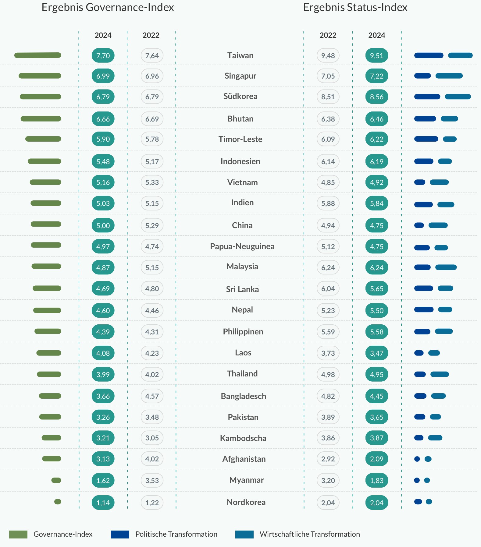 Während der regionale Durchschnitt des Governance-Index gegenüber dem BTI 2022 nochmals um 0,19 auf nun nur noch 4,65 Punkte sinkt, bleibt die Steuerung der Transformation in Taiwan sehr gut. Im Gesamtranking belegt die Insel sogar den ersten Platz – und dies, obwohl die verschärften Spannungen zwischen Beijing und Taipei mit einer Zunahme der Polarisierung zwischen den politischen Lagern einhergehen, in deren Mittelpunkt die eng miteinander verknüpften Fragen der nationalen Identität und der Beziehungen zwischen Taiwan und Festlandchina stehen. Als weiteres gutes und außergewöhnliches Beispiel präsentiert sich Singapur. Obwohl die seit 1959 regierende People’s Action Party keine Bereitschaft erkennen lässt, mehr demokratische Spielräume zu ermöglichen, liegt der Stadtstaat in puncto Gestaltungsfähigkeit und effizientem Ressourceneinsatz sogar an der Spitze des BTI-Rankings.