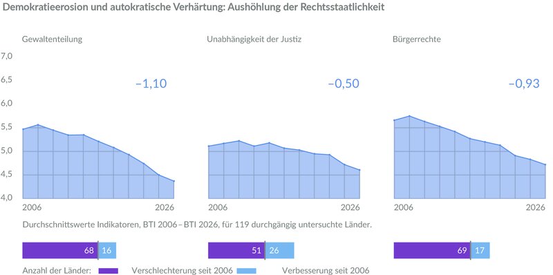 In der Folge hat das globale Verhältnis von Demokratien und Autokratien umgekehrt: waren im BTI 2006 noch 55 Prozent aller untersuchten Staaten Demokratien, so werden heute 56 Prozent der Staaten autokratisch regiert. Zwei Drittel dieser Autokratien sind hochgradig repressive Diktaturen oder zerfallende Staaten. Der Anteil harter Autokratien stieg mit 38% aller untersuchten Staaten auf ein neues Höchstniveau. Zwei Drittel der seit 2006 untersuchten Länder sind heute weniger demokratisch als vor 20 Jahren.