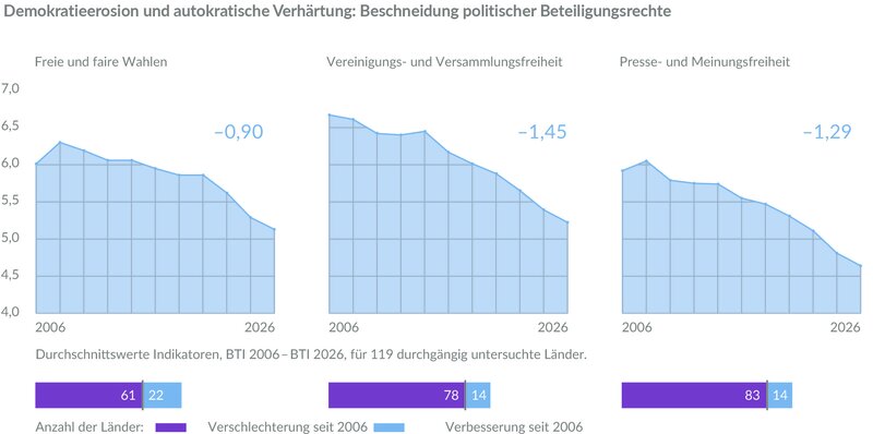 Die Substanzverluste bei Meinungs- und Pressefreiheit sowie bei Organisations- und Versammlungsrechten der vergangenen zehn Jahre haben sich fortgesetzt. Während 2016 nur ein Viertel der Länder grundlegende politische Beteiligungsrechte verwehrte, sind es im BTI 2026 bereits rund 40 Prozent. Hinter dem gravierenden Einbruch bei Meinungs- und Pressefreiheit stehen zunehmende Repressionen gegen Journalist:innen, restriktive Gesetze gegen „Fake News“ oder Diffamierung, staatlich dominierte Medienmärkte sowie digitale Überwachung und Internetabschaltungen. Die Räume für offenen Diskurs und politische Teilhabe sind weltweit enger geworden.