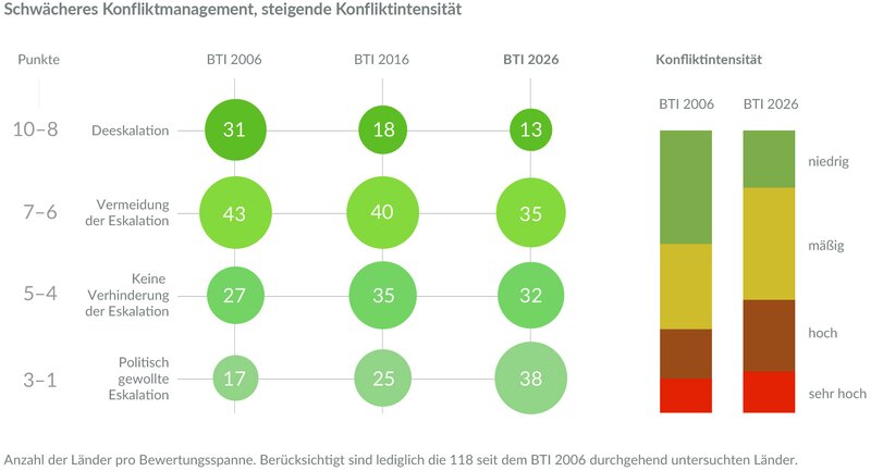 Der Rückgang des politischen Zielkonsenses zu Demokratie und Marktwirtschaft hält an, verbunden mit Polarisierung, schwächerer Einbindung der Zivilgesellschaft, verschlechtertem Konfliktmanagement und sinkender internationaler Kooperationsbereitschaft.