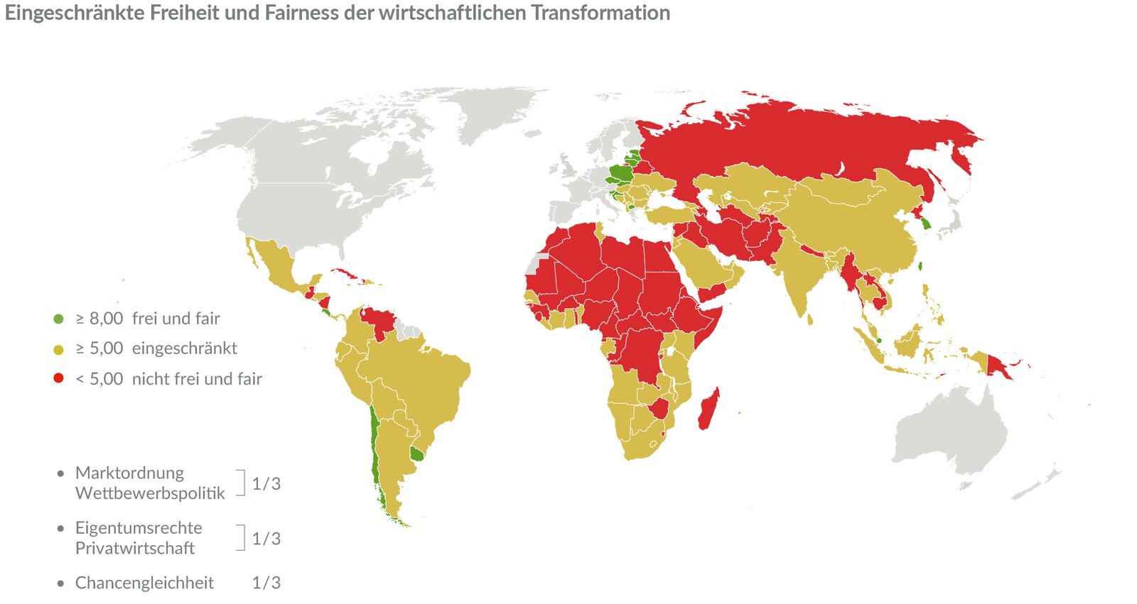 Makroökonomische Stabilität und wirtschaftliche Leistungsstärke sind nicht allein vom politischen System abhängig. Exportorientiere Autokratien wie Singapur und Vietnam oder die rohstoffreichen arabischen Golfstaaten gehören zu den wirtschaftlichen Spitzenreitern, während in Ostmittel- und Südosteuropa Demokratien wie Slowenien und Polen langfristig stabil sind. Gleichzeitig profitieren Länder in Osteuropa und Zentralasien vom Ukrainekrieg oder von Handelsumlenkungen der Sanktionen gegen Russland. Doch insgesamt steht die nachhaltige wirtschaftliche Transformation vielerorts auf einem wackligen Unterboden, wenn sie nicht von Rechtssicherheit, zuverlässigen Wettbewerbsordnungen und inklusiven Institutionen aufrechterhalten wird.
