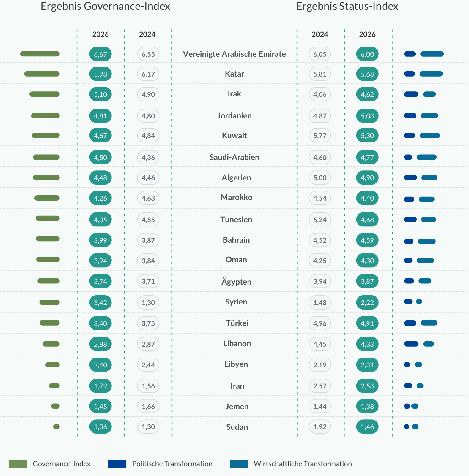 Gleichzeitig haben Israels Militärschläge gegen den Iran sowie seine Verbündeten, die Hizbullah in Libanon und die Huthi-Rebellen in Jemen, das Mullah-Regime enorm geschwächt. Zudem scheinen Syrien, nach dem Sturz des Assad-Regimes im Dezember der politische Aufsteiger im BTI 2026, und der ökonomisch wie politisch zunehmend stabilere Irak sich vom iranischen Machtnetzwerk zu emanzipieren.