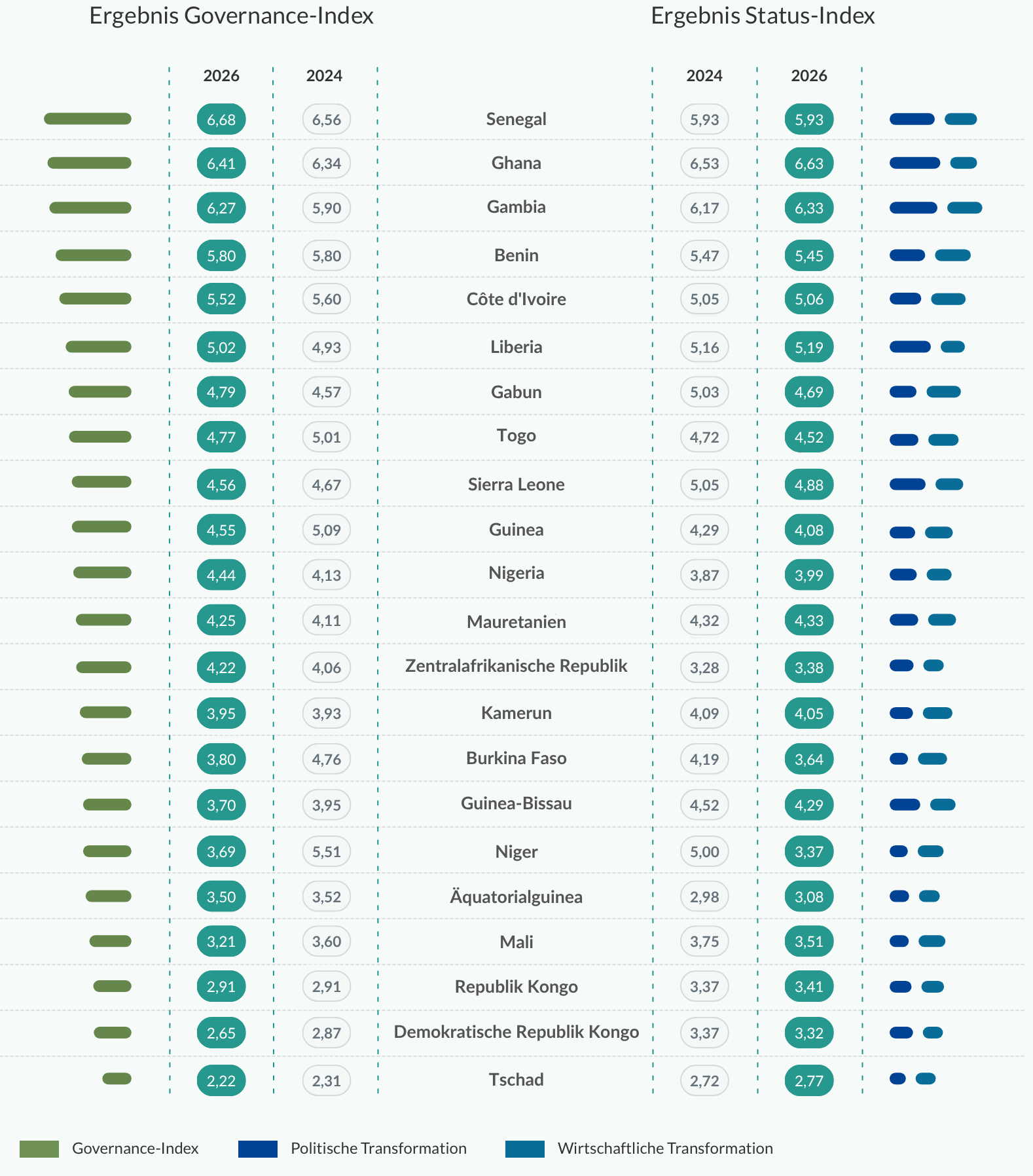 Demgegenüber zeichnen sich Senegal und Ghana weiterhin durch eine gute Qualität der Governance aus (Rang 15 bzw. 20 im Gesamtranking). Die neue Regierung im Senegal unter Präsident Faye setzt auf eine produktive Kontinuität. Zudem besteht eine hohe Zustimmung zur Demokratie. In beiden Ländern verfügen reformorientierte Kräfte über Einfluss und die internationale Kooperation funktioniert. In Nigeria reicht eine leichte Verbesserung der Governance-Qualität zu einem Aufstieg in die Reihe der „mäßig“ erfolgreichen Regierungen. Maßgeblich hierfür ist die bessere Politikpriorisierung und -implementierung, vor allem in Bezug auf die Umsetzung der Kürzung der Kraftstoff- und Stromsubventionen sowie der Konsolidierung des Wechselkurses der Naira. Leicht verbessert hat sich auch Gabun, wo eine neue Verfassung nach einem „nationalen Dialog“ im November 2024 mit 92% der Stimmen angenommen wurde. „Selten hatten Mitglieder der Zivilgesellschaft solch eine direkte Wirkung“, hält der Länderbericht fest.