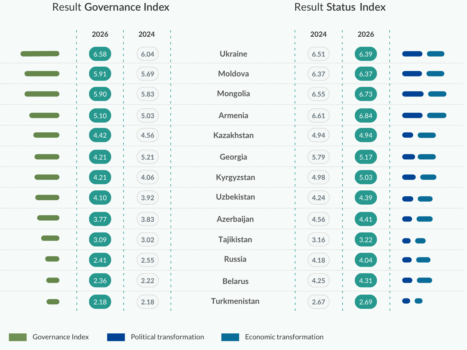 Russia, reaffirming its status as a hard-line autocracy with what the BTI designates as failed governance, remains near the bottom of the global rankings, just ahead of the region’s usual poor performers; Tajikistan and Turkmenistan. This stands as a stark symbol of the region’s ongoing authoritarian consolidation. In sharp contrast, the primary target of Russian aggression – Ukraine – continues to demonstrate remarkable resilience in the fourth year of the war. Both its professional wartime management under extremely difficult conditions and its government’s ability to maintain political consensus remain impressive.
