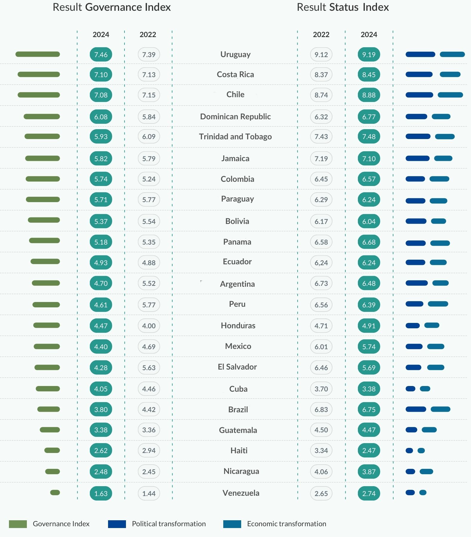 For years, the course of transformation in many Latin American and Caribbean nations has been adrift, devoid of a clear direction. Lacking a basic consensus on how to move forward, many countries have failed to address institutional weaknesses in their economies, and polarizing political styles have become commonplace. However, amid these challenges, there are still noteworthy success stories, with the BTI 2024 showing some democratic comebacks.