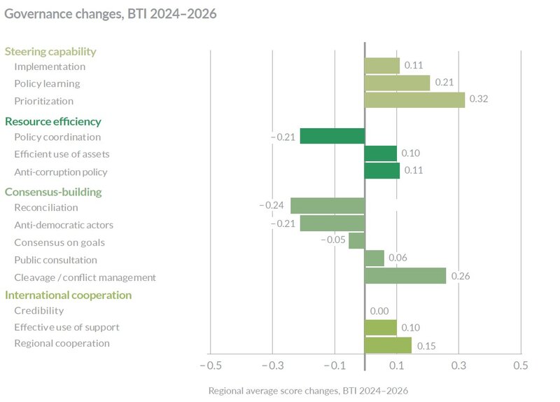 The wars in the Gaza Strip and Sudan, along with the collapse of the Assad regime in Syria, are having a profound impact on regional developments. In the Israeli-Palestinian conflict, in particular, regional power players have turned to a pragmatic, realpolitik approach. Domestically, however, governments continue to rule with an iron grip – even in countries where the Arab Spring’s influence lasted longest. One of the BTI 2026’s few positive surprises is Iraq, which shows signs of increasing stability.
