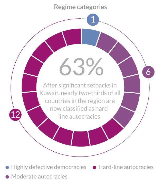 Kuwait’s recent political developments are cause for concern. For the first time in BTI history, the Gulf monarchy is no longer classified as a moderate but as a hard-line autocracy (–0.75 points). The shift follows the accession of Sheikh Meshal al-Ahmad al-Jaber, who assumed the throne on December 16, 2023, at age 83, after serving as crown prince. Since taking power, the emir has adopted a markedly more authoritarian governing style, most visibly in his confrontation with Kuwait’s National Assembly, which was long regarded as one of the most empowered legislative bodies in the Gulf. Following a protracted standoff, he dissolved the assembly by decree on May 10, 2024, declaring that new elections would not be held until after the adoption of an entirely revised constitution, which is unlikely to take place before 2028.