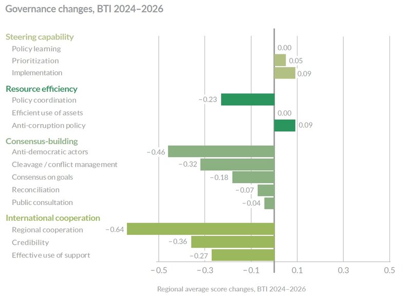 In Ghana, by contrast, pressure on democratic governance is mounting. Ranking 19th globally in the BTI index on political transformation, the country continues to lead the regional rankings, though the country report highlights declines in freedom of assembly and public support for democracy. The December 2024 elections, which were won by the opposition on promises of economic renewal, were evaluated as free and fair in the BTI. Still, the six deaths, 46 injuries, and incidents of property damage reported by the Ghana Center for Democratic Development underscore the underlying potential for conflict in the country.