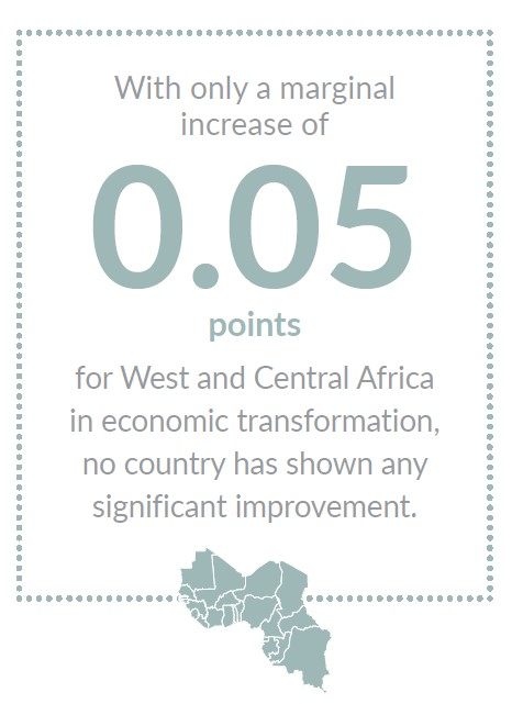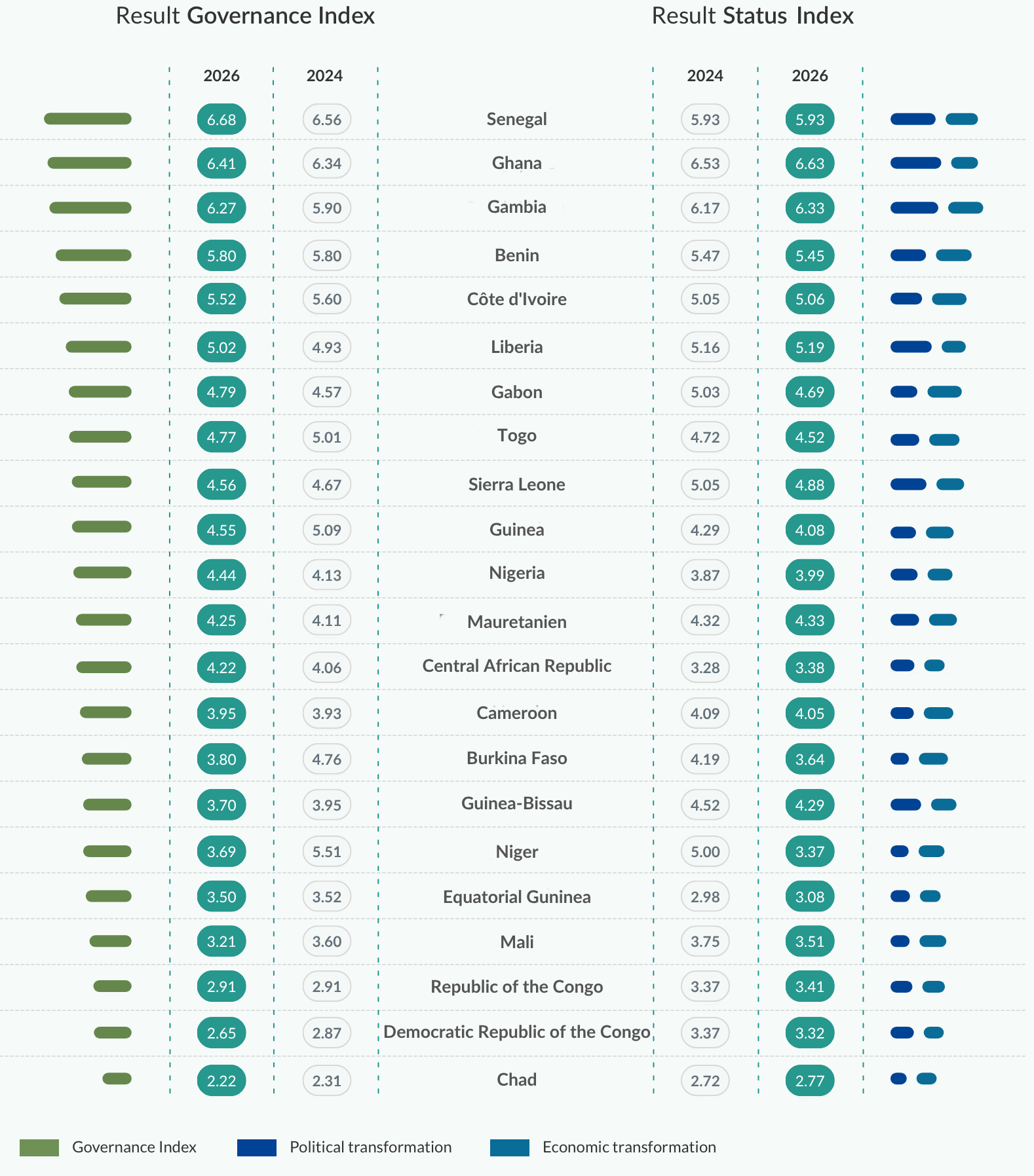 Across the region, economic trajectories are largely converging. The region’s countries fall into two clusters: Ghana, Benin, Gambia, Côte d’Ivoire and Gabon are classified as featuring a limited state of economic transformation. The region faces entrenched structural barriers that are being compounded by the effects of climate change. Still, the country reports suggest that the sharp downturn – exacerbated by the COVID-19 pandemic – may have bottomed out. In terms of governance quality, the variation mirrors the political landscape, ranging from good to failed governance. When the steep declines in Niger and Burkina Faso are factored out, the broader trend points decisively toward stagnation.